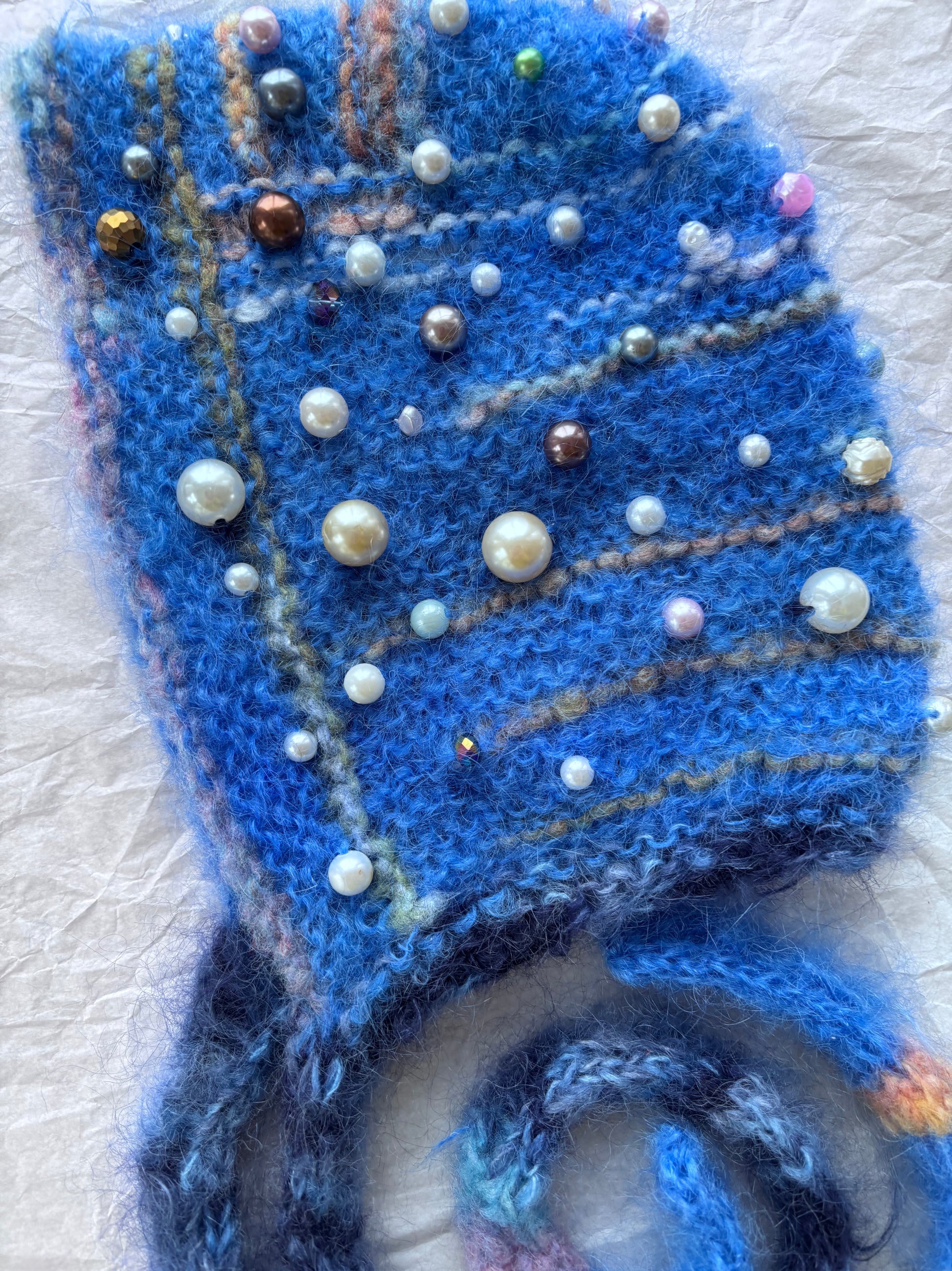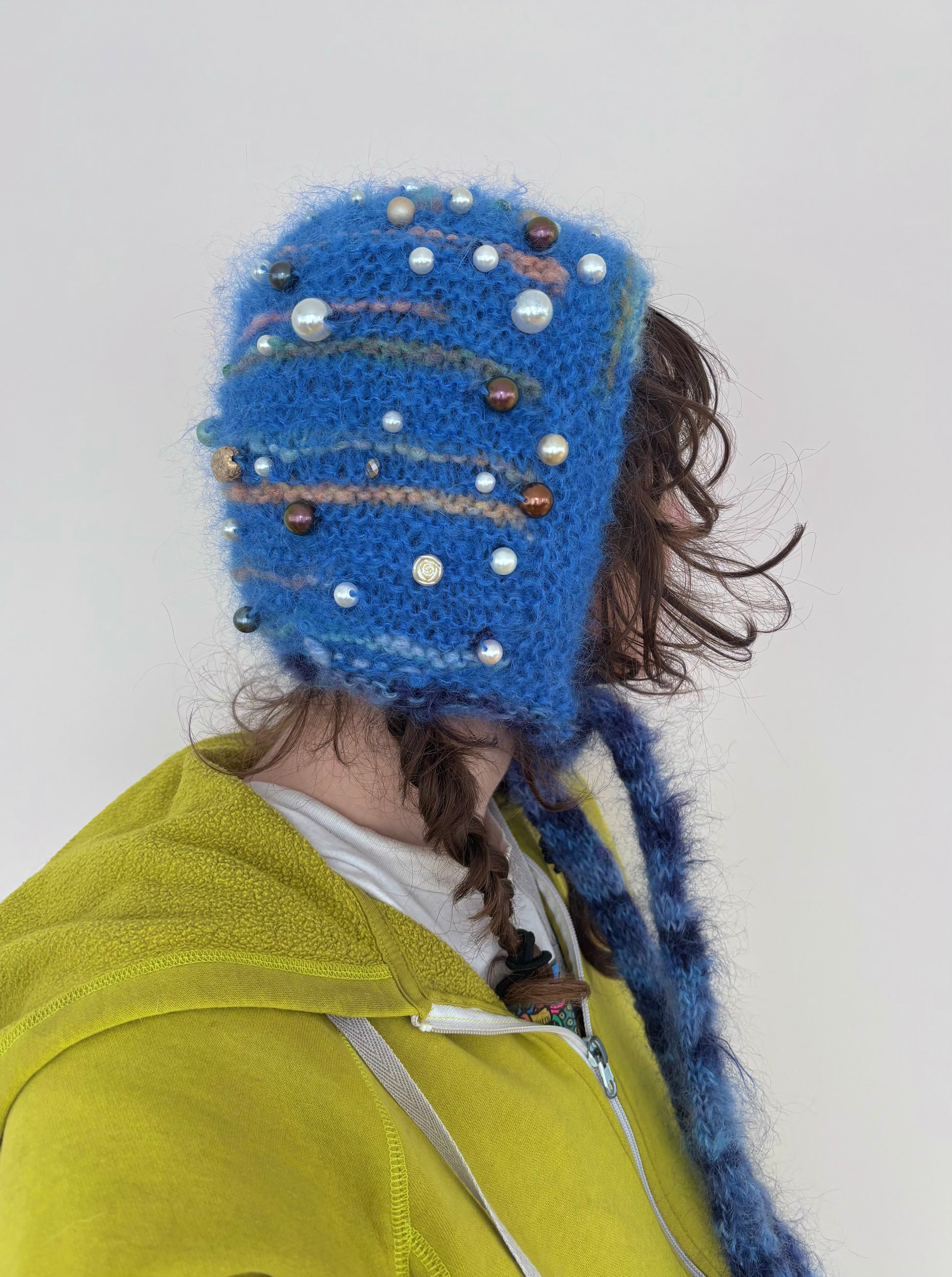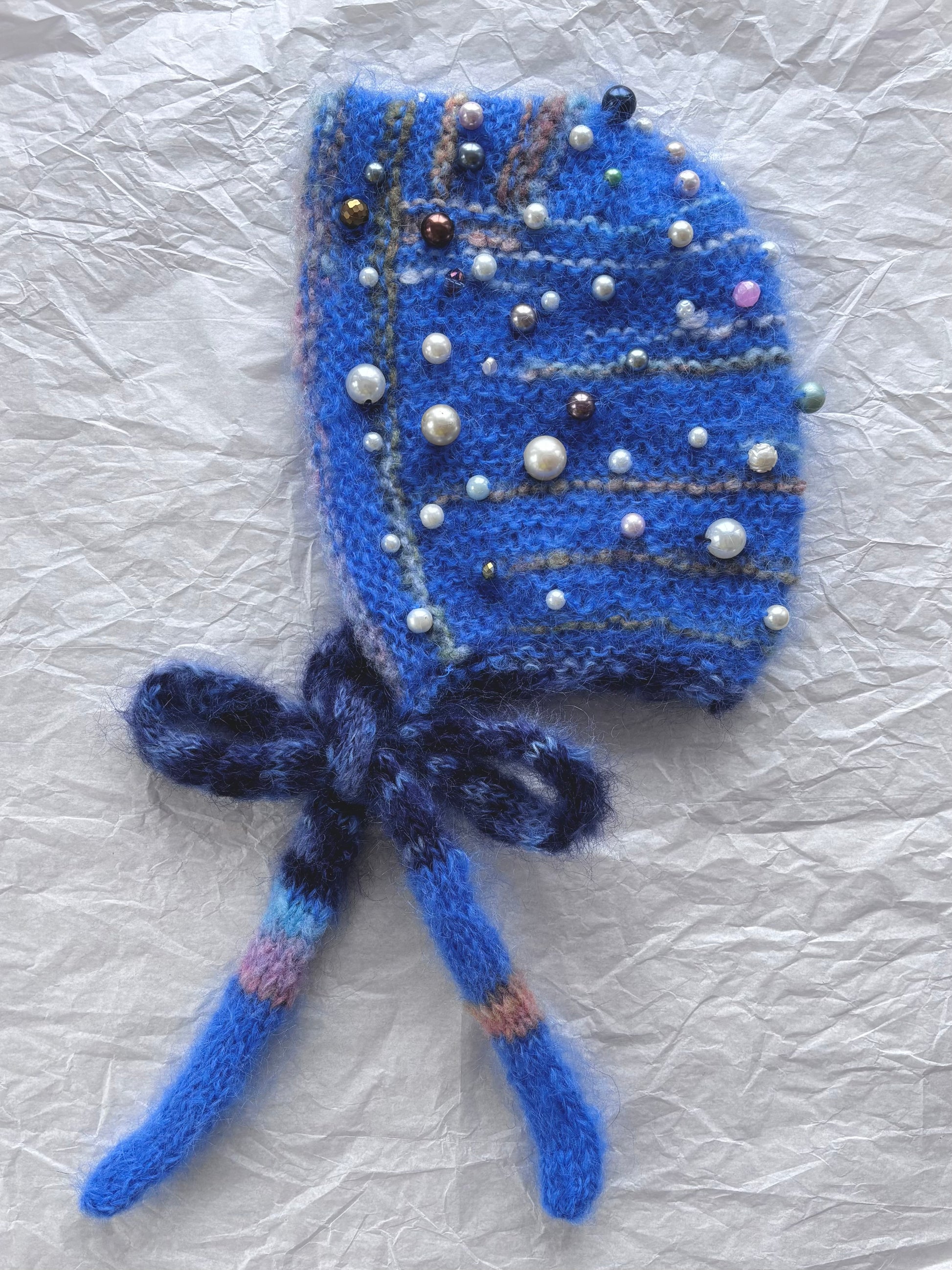 Bauble Bonnets are hand knit with vintage mohair & or vintage mohair blend yarn and adorned with vintage/secondhand beads and gems. Each bonnet is one of one and totally unique.