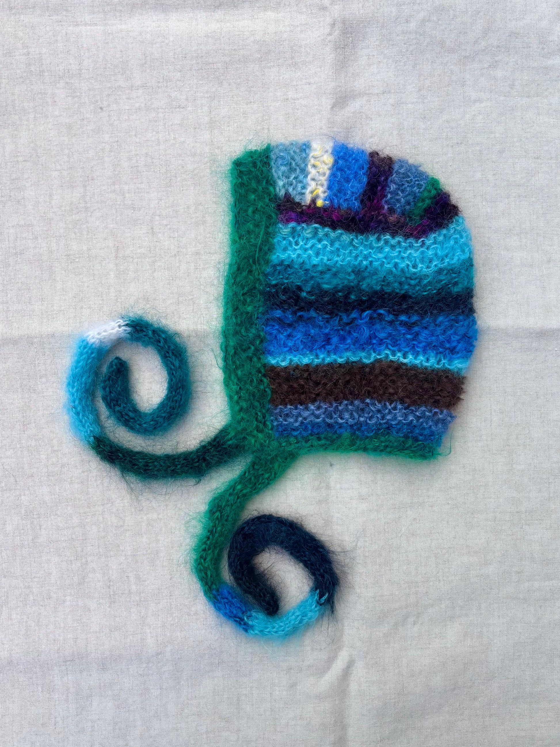 Bonnets are hand knit with vintage mohair & or vintage mohair blend yarn. Each bonnet is one of one and totally unique.