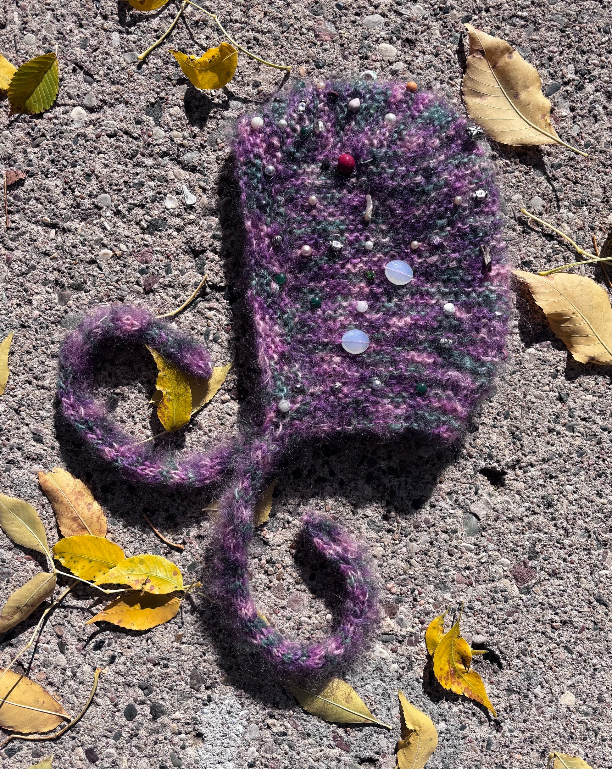 Bauble Bonnets are hand knit with vintage mohair & or vintage mohair blend yarn and adorned with vintage/secondhand beads and gems. Each bonnet is one of one and totally unique.
