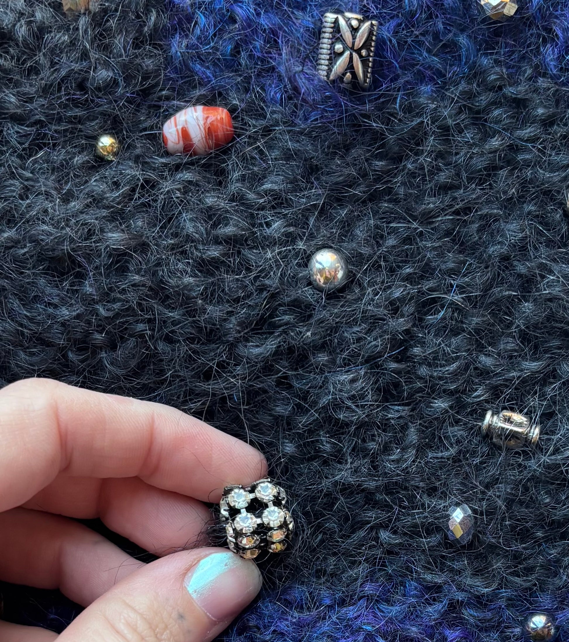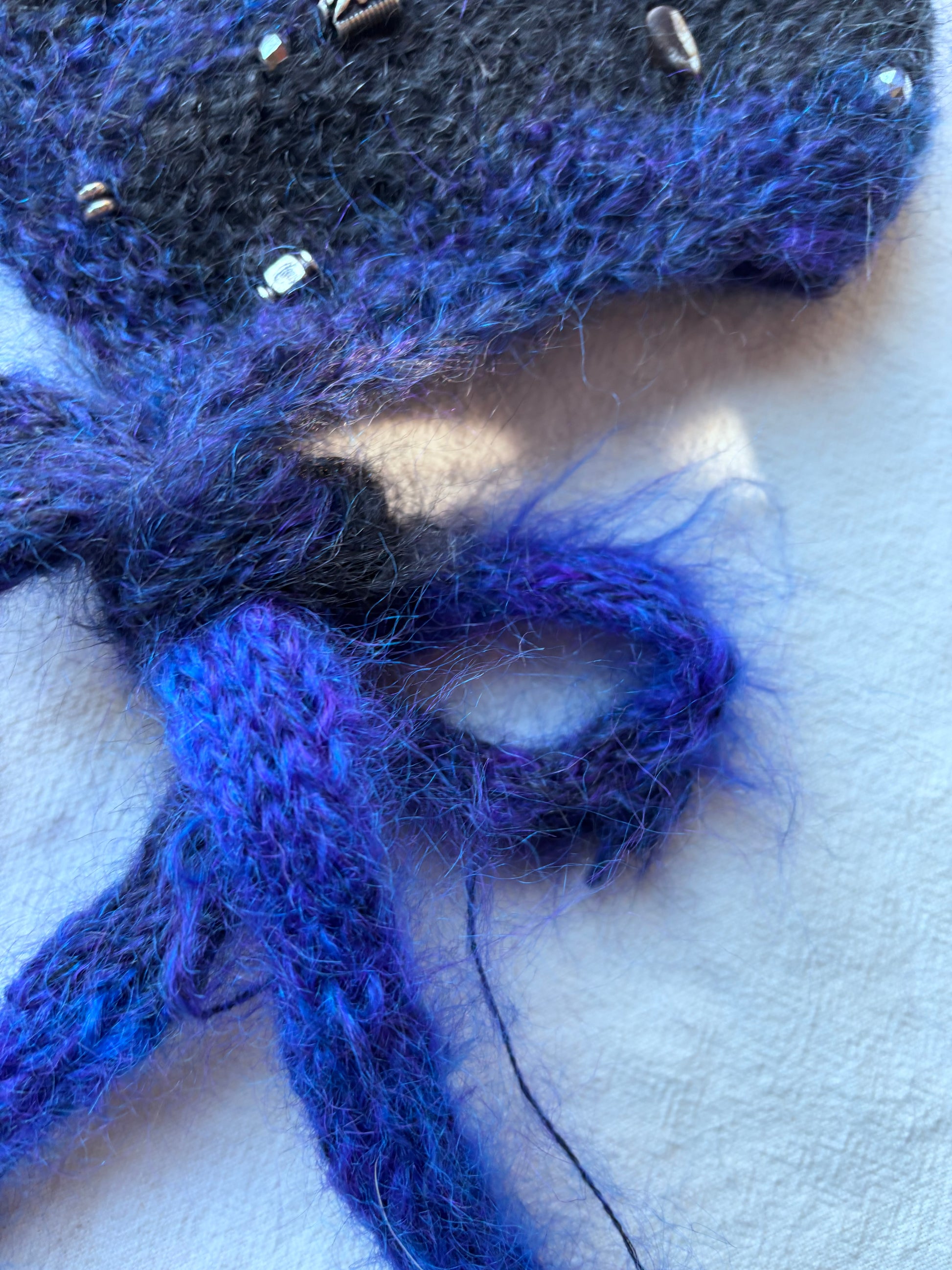 Bauble Bonnets are hand knit with vintage mohair & or vintage mohair blend yarn and adorned with vintage/secondhand beads and gems. Each bonnet is one of one and totally unique.