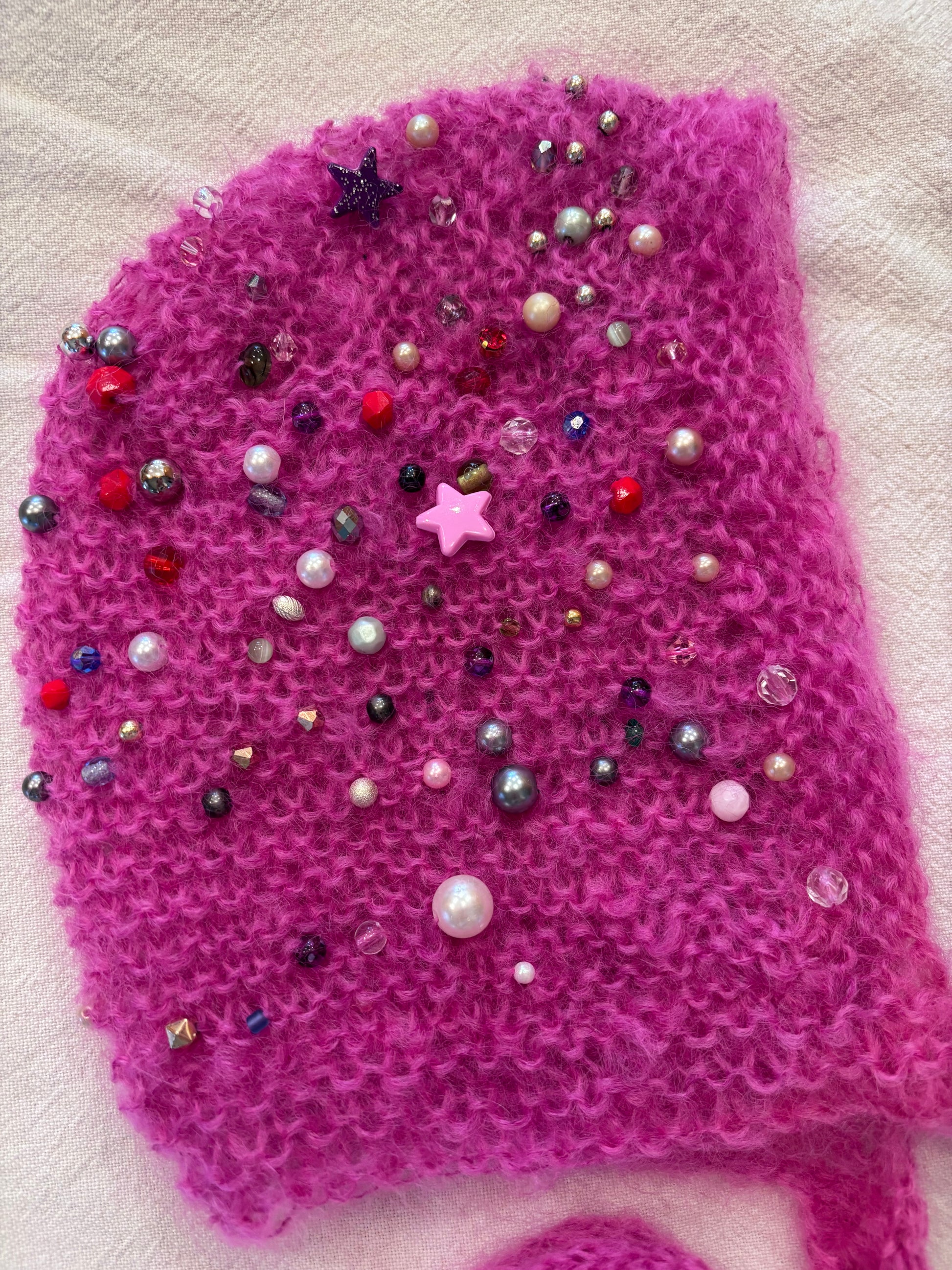 Bauble Bonnets are hand knit with vintage mohair & or vintage mohair blend yarn and adorned with vintage/secondhand beads and gems. Each bonnet is one of one and totally unique.