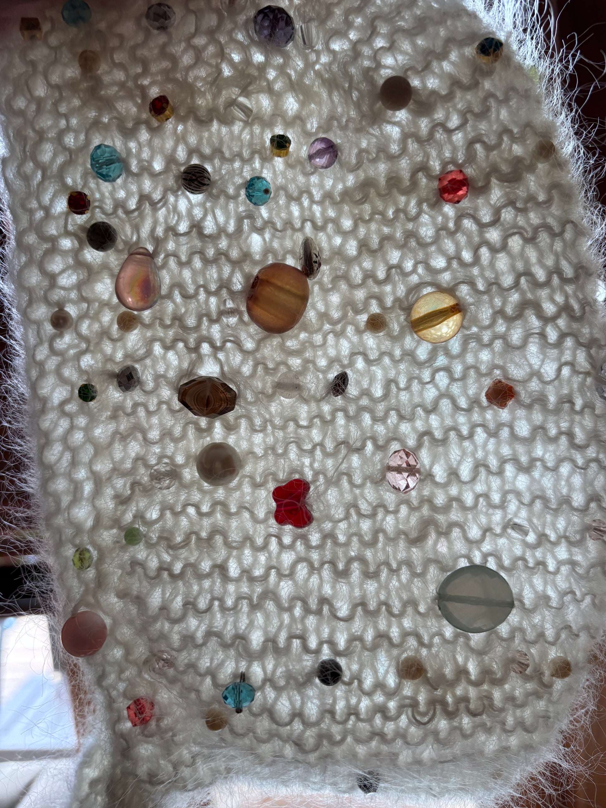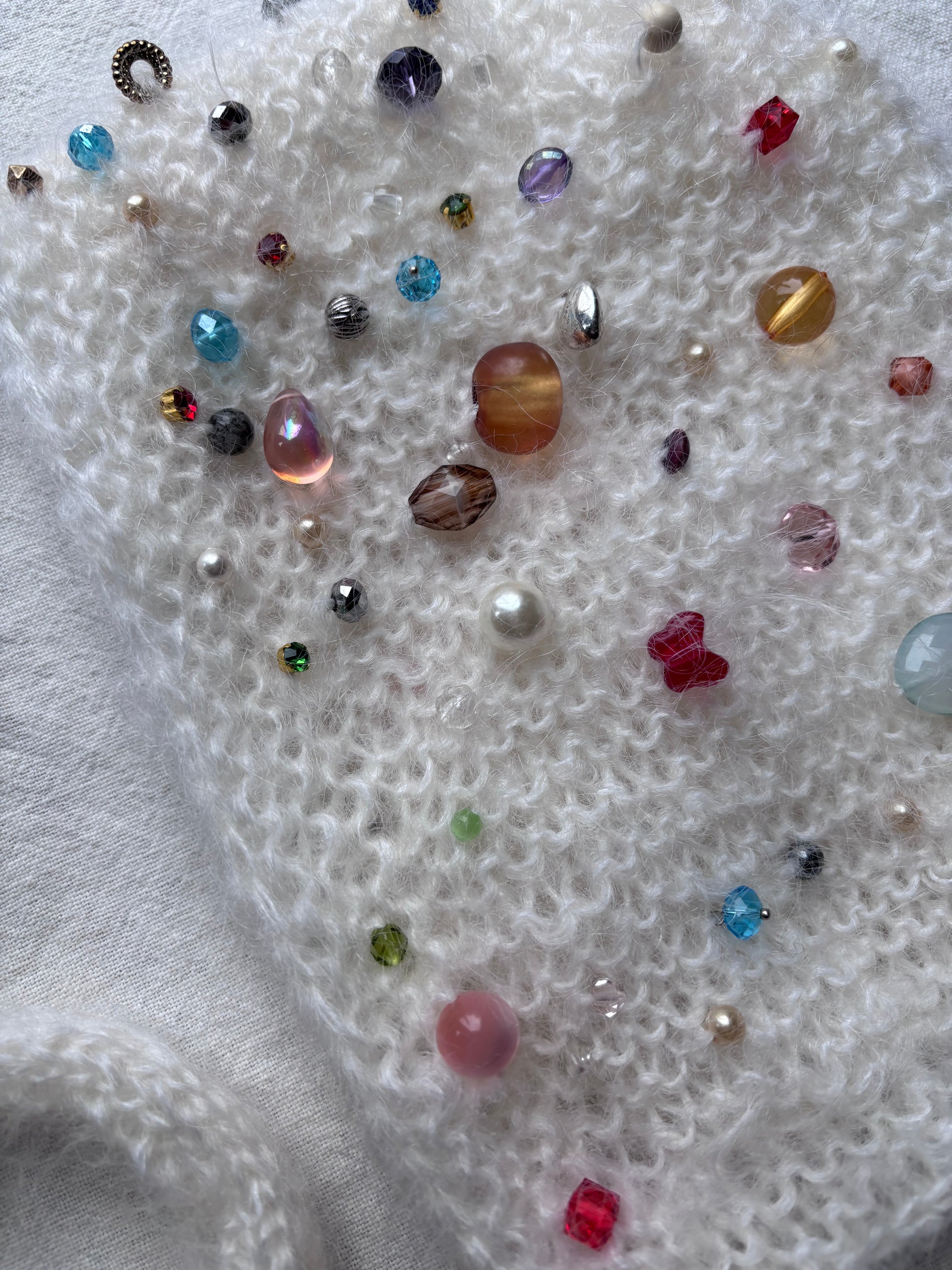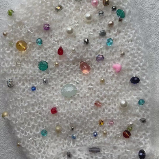 Bauble Bonnets are hand knit with vintage mohair & or vintage mohair blend yarn and adorned with vintage/secondhand beads and gems. Each bonnet is one of one and totally unique.